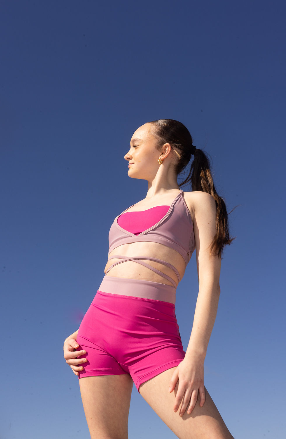 Introducing the Hampton Set for dancers who demand function and style. Sweat-proof, stretchy material matches your studio energy. Vibrant blue and pastel pink with a mesh back cut-out ensure you look dynamic. Perfect for high-energy moments or just a good stretch,